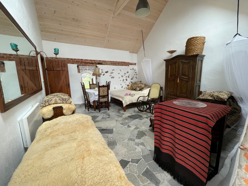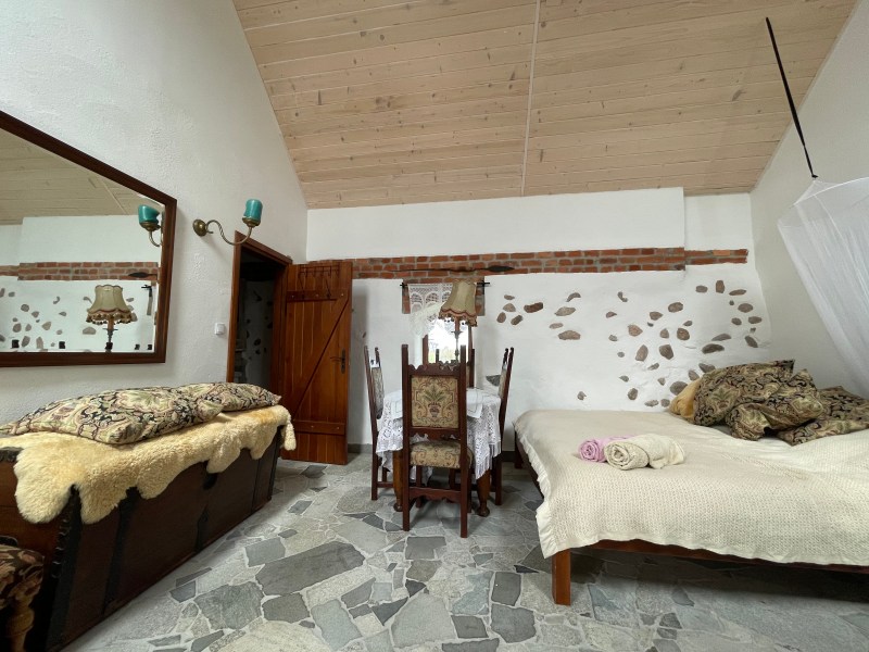 Najbardziej KAMERALNY ze wszystkich. Dwuosobowy pokój z ODDZIELNYM wejściem Z PODWÓRKA i Z łazienką. W łazience znajduje się toaletka oraz leżanka idealna do schłodzenia się w gorący, letni dzień oraz ogrzania w zimowy wieczór.